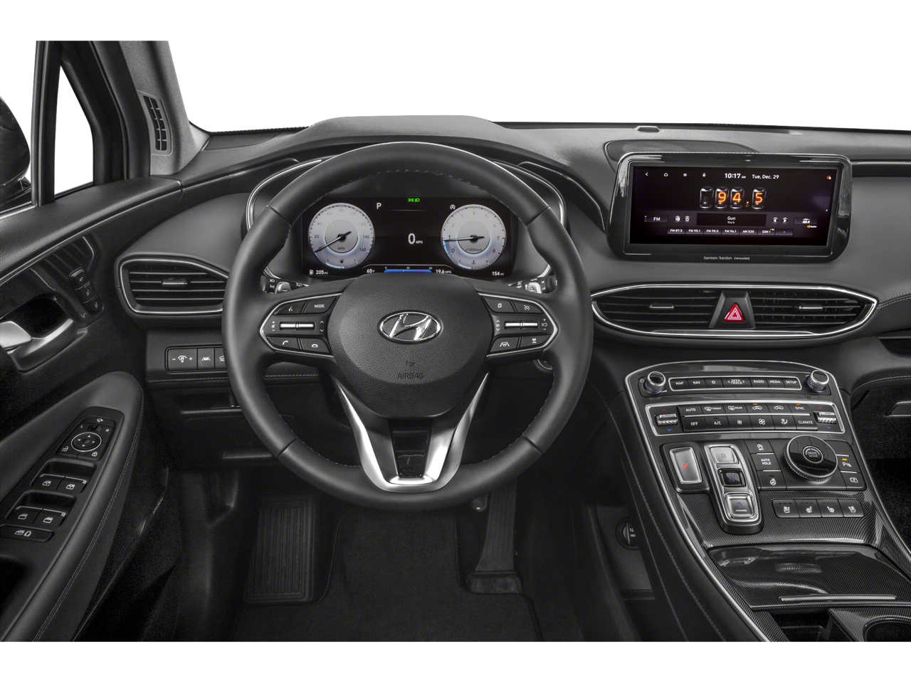 - Radio: AM/FM/MP3 Harman Kardon Display Audio -inc: 630 Watts, 10.25" wide touchscreen, Apple CarPlay and Android Auto, Bluetooth® hands-free w/wireless audio streaming, voice recognition, steering wheel audio, cruise and phone controls, dual front USB ports, SiriusXM, HD Radio, Blue Link connected car system, 12 speakers including subwoofer, external amplifier, Clari-Fi music restoration technology, QuantumLogic surround, onboard navigation system w/traffic flow including incident data via HD Radio (HERE), rear seat quiet mode and wireless device charging