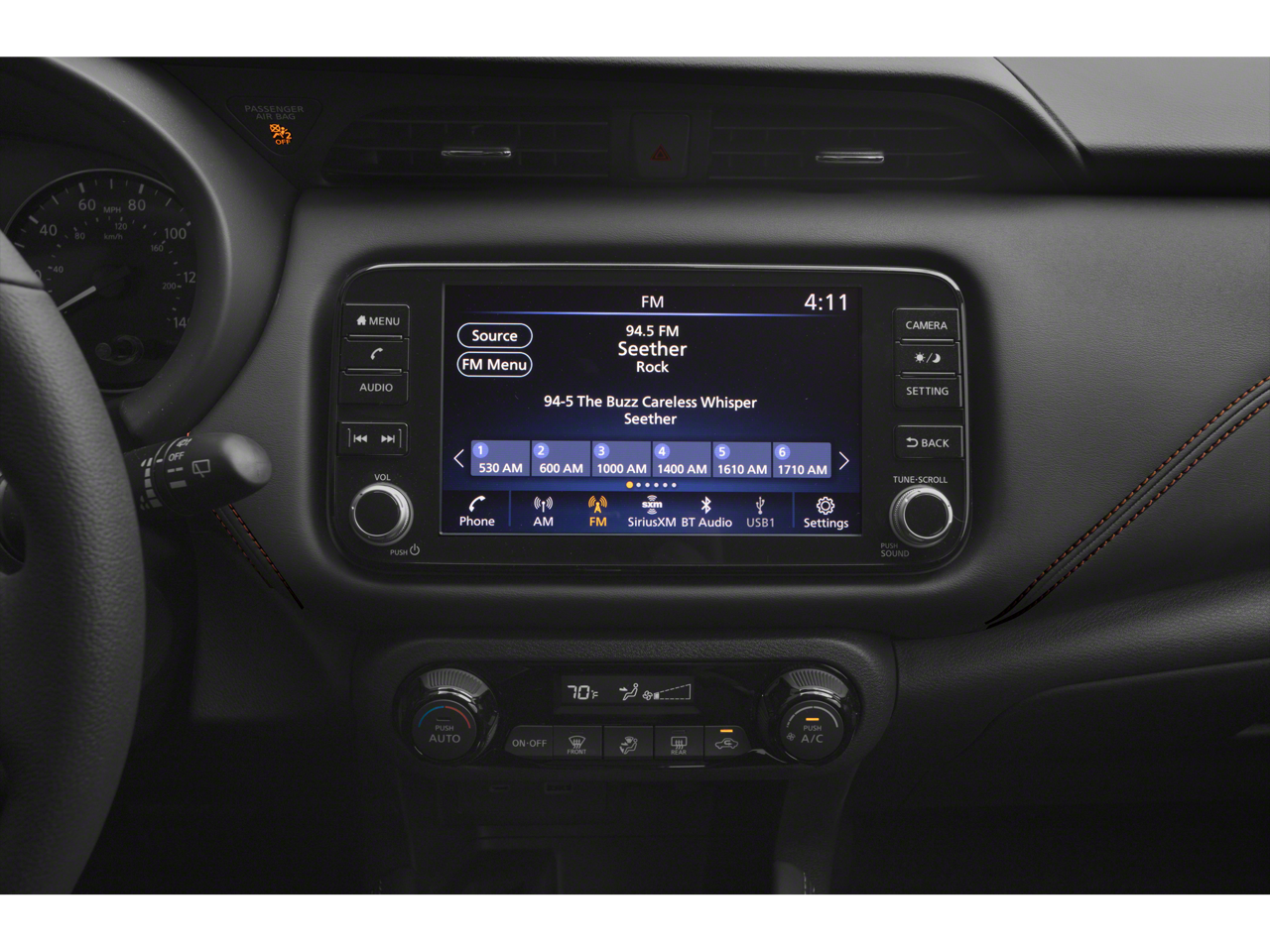 - Radio: AM/FM Audio System -inc: 8" color touchscreen display w/6 speakers, Bluetooth® hands-free phone system, streaming audio via Bluetooth®, Siri eyes free, audio and Bluetooth® steering wheel switches, 3 USB ports (1x front charge and data and 2x rear charge only), type C USB (data and charge) (front), NissanConnect featuring Apple CarPlay, Android Auto, SiriusXM satellite radio w/advanced audio features and hands-free text messaging assistant